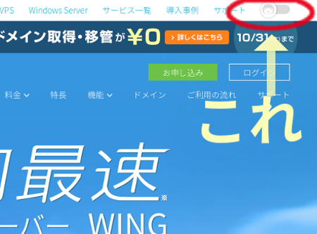 改めてよく見ると、ConoHa Wingの公式サイト自体にも同じ設定がありました。気になる方は、コノハ公式サイト右上にある金太郎飴みたいなボタンをONにしてみてください。